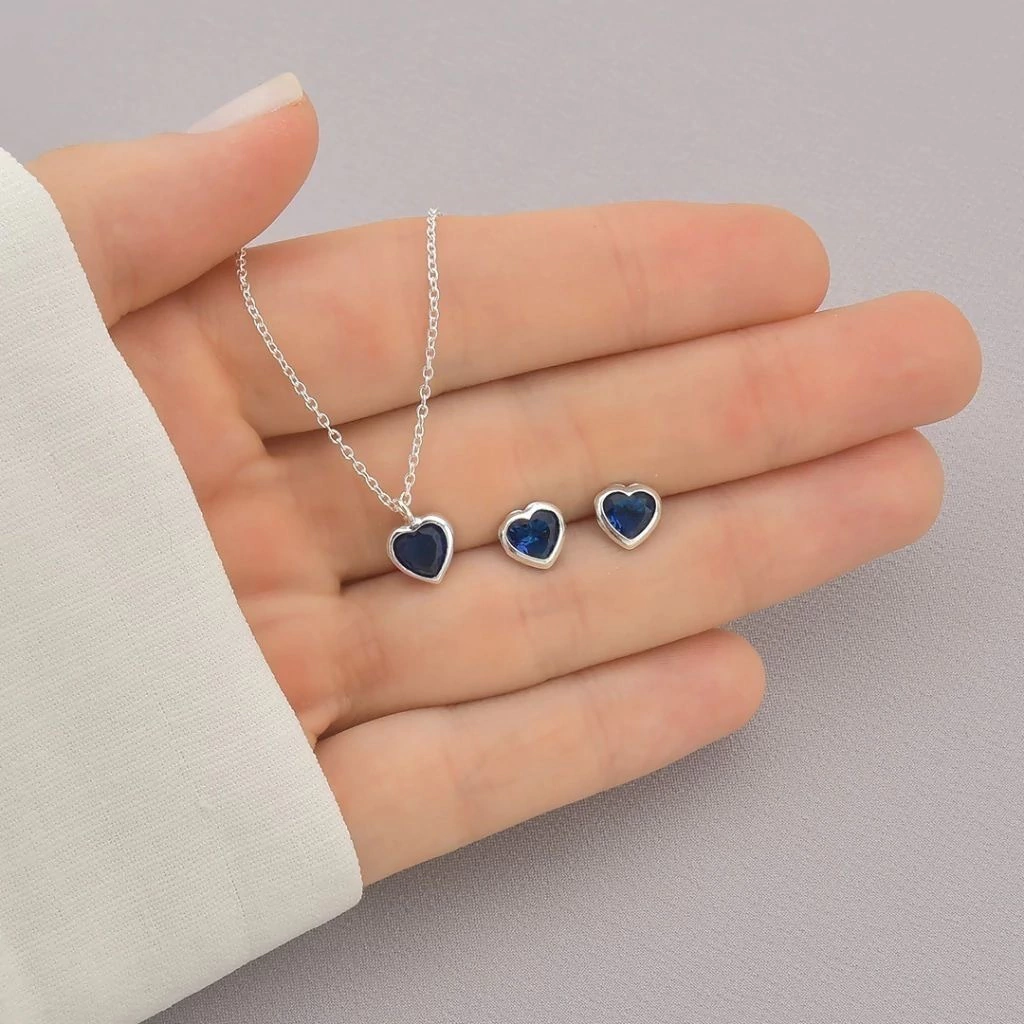 Conjunto Ponto de Luz Coração Azul Escuro de Prata