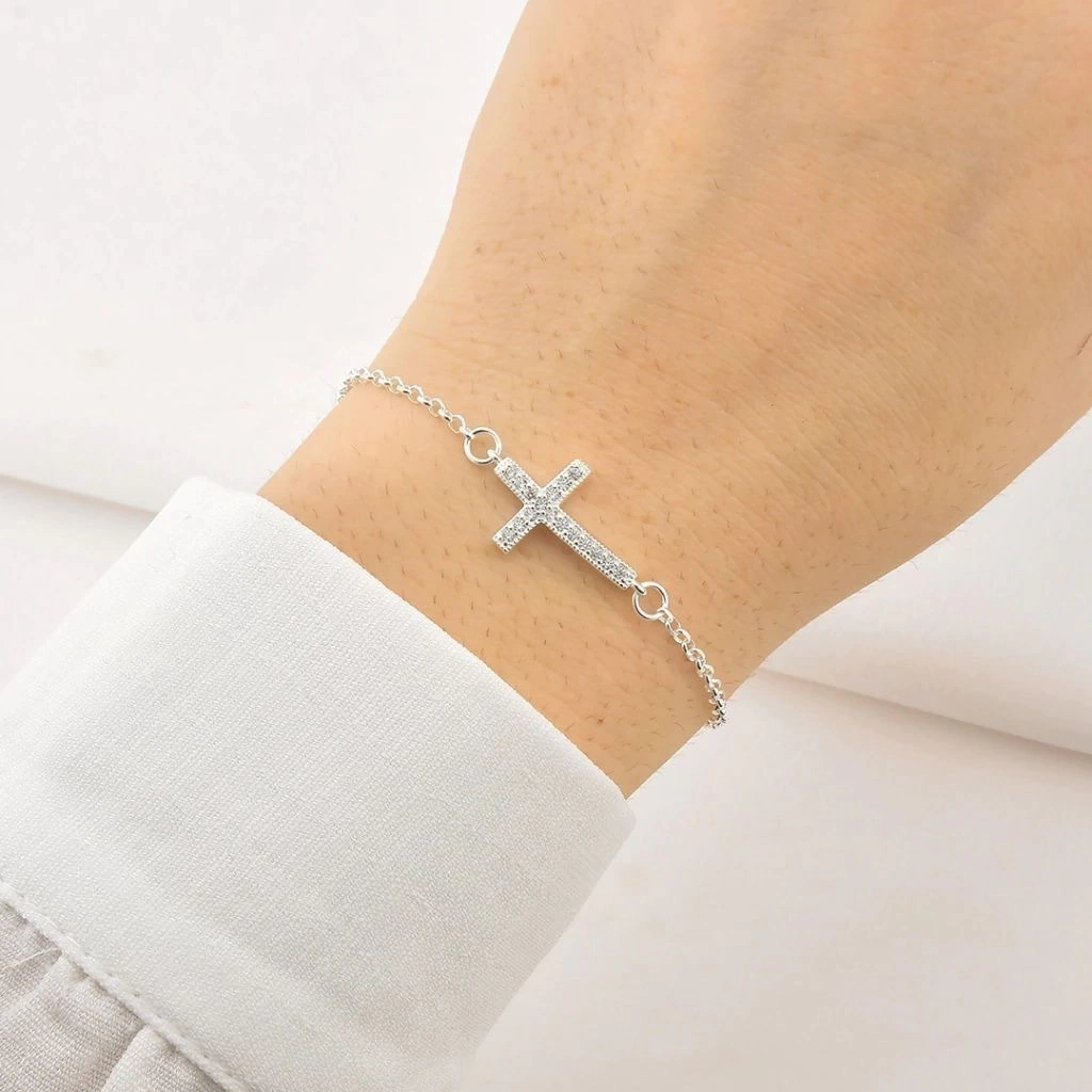 Delicada e sofisticada, a Pulseira Cruz Cravejado Curvada de Prata é perfeita para quem busca um acessório espiritual e elegante. Feita em Prata 925 e com uma cruz levemente curvada cravejada de zircônias, essa peça destaca-se pela delicadeza e brilho.